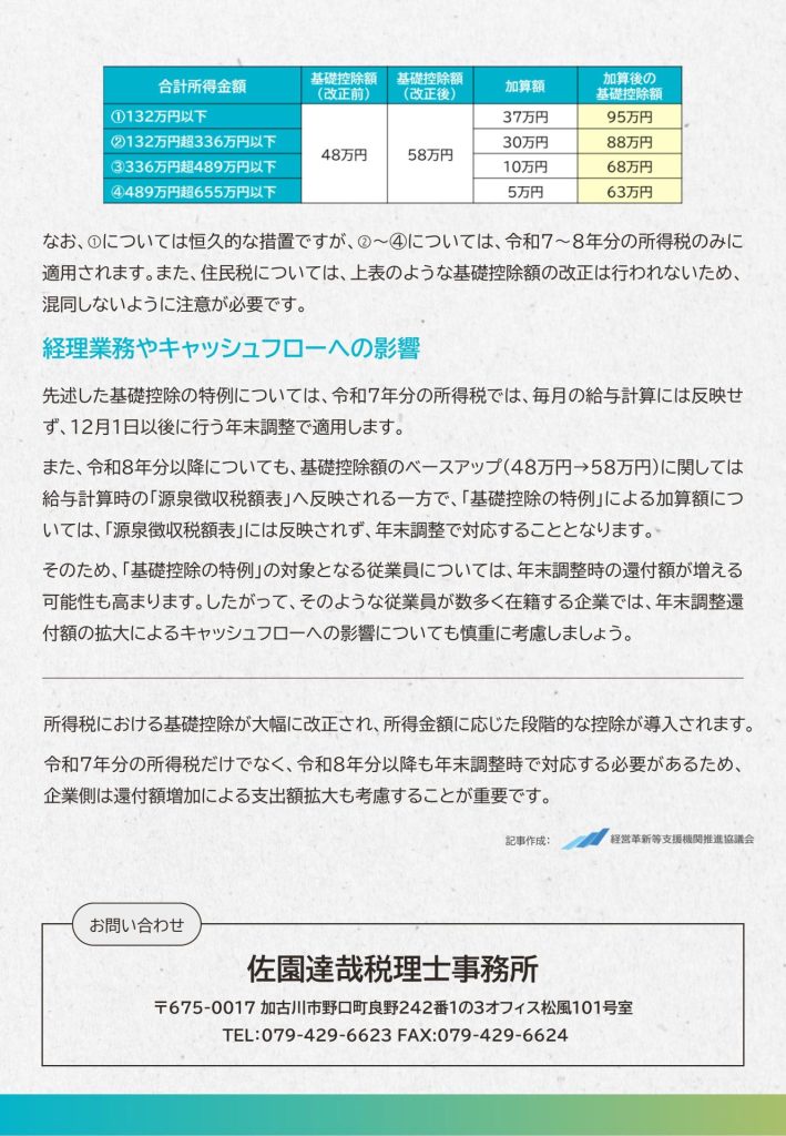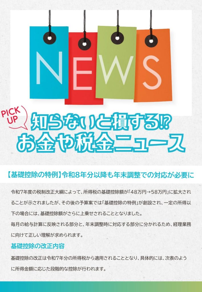 2025年10月21日 / 最終更新日時 : 2025年10月21日 saen-zeirishi 知らないと損する!?お金や税金ニュース 【基礎控除の特例】令和8年分以降も年末調整での対応が必要に 令和7年度の税制改正大綱によって、所得税の基礎控除額が「48万円→58万円」に拡大されることが示されましたが、その後の予算案では「基礎控除の特例」が創設され、一定の所得以下の場合には、基礎控除額がさらに上乗せされることとなりました。 毎月の給与計算に反映される部分と、年末調整時に対応する部分に分かれるため、経理業務に向けて正しい理解が求められます。