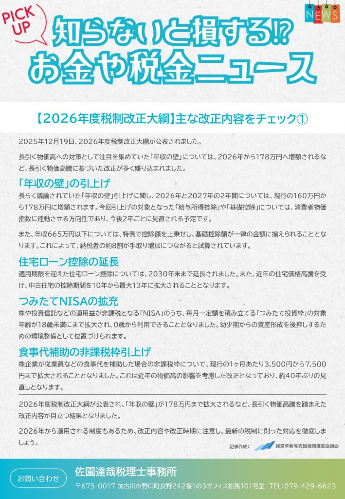 2026年1月26日 / 最終更新日時 : 2026年1月26日 saen-zeirishi 知らないと損する!?お金や税金ニュース 【2026年度税制改正大綱】主な改正内容をチェック① 2025年12月19日、2026年度税制改正大綱が公表されました。 長引く物価高への対策として注目を集めていた「年収の壁」については、2026年から178万円へ増額されるなど、長引く物価高騰に基づいた改正が多く盛り込まれました。